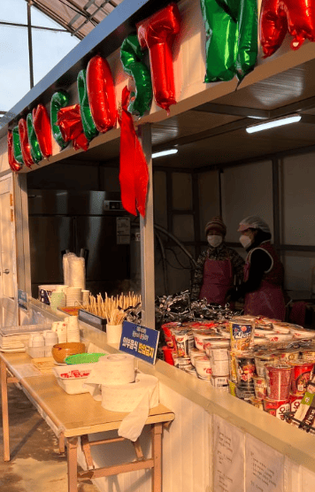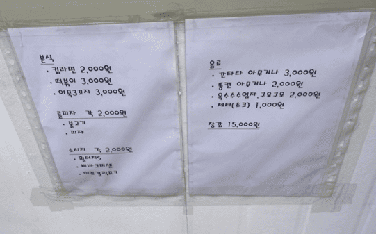 : 컵라면, 떡볶이, 어묵, 롤피자, 소시지 등을 먹을 수 있습니다.