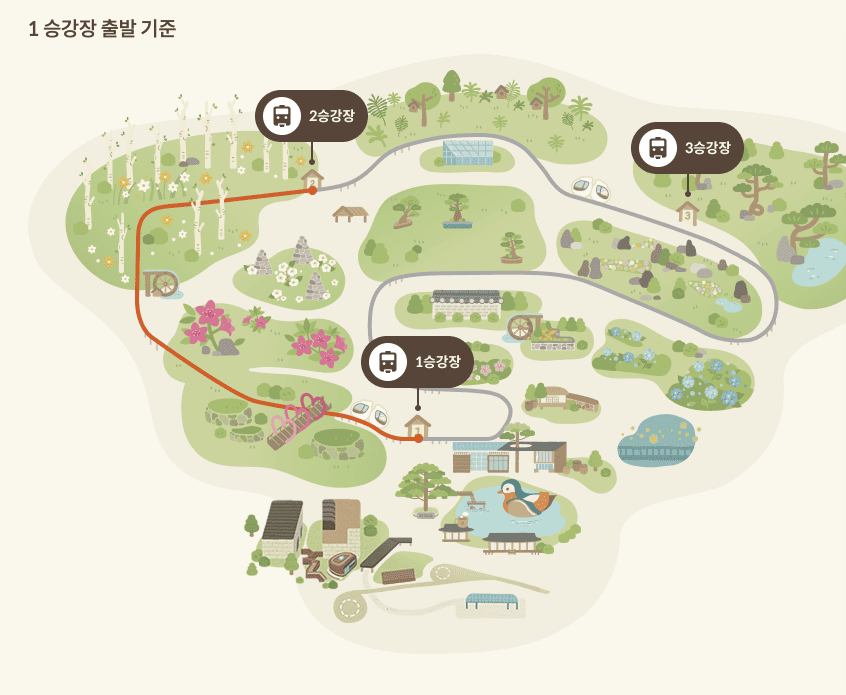 모노레일은 노약자의 편리하고 안전한 관람을 위해 화담숲 서쪽 이끼원 입구-화담숲 정상-분재원 사이를 지나는 1,213m 순환선으로 전체 운행 소요시간은 약 20분입니다.