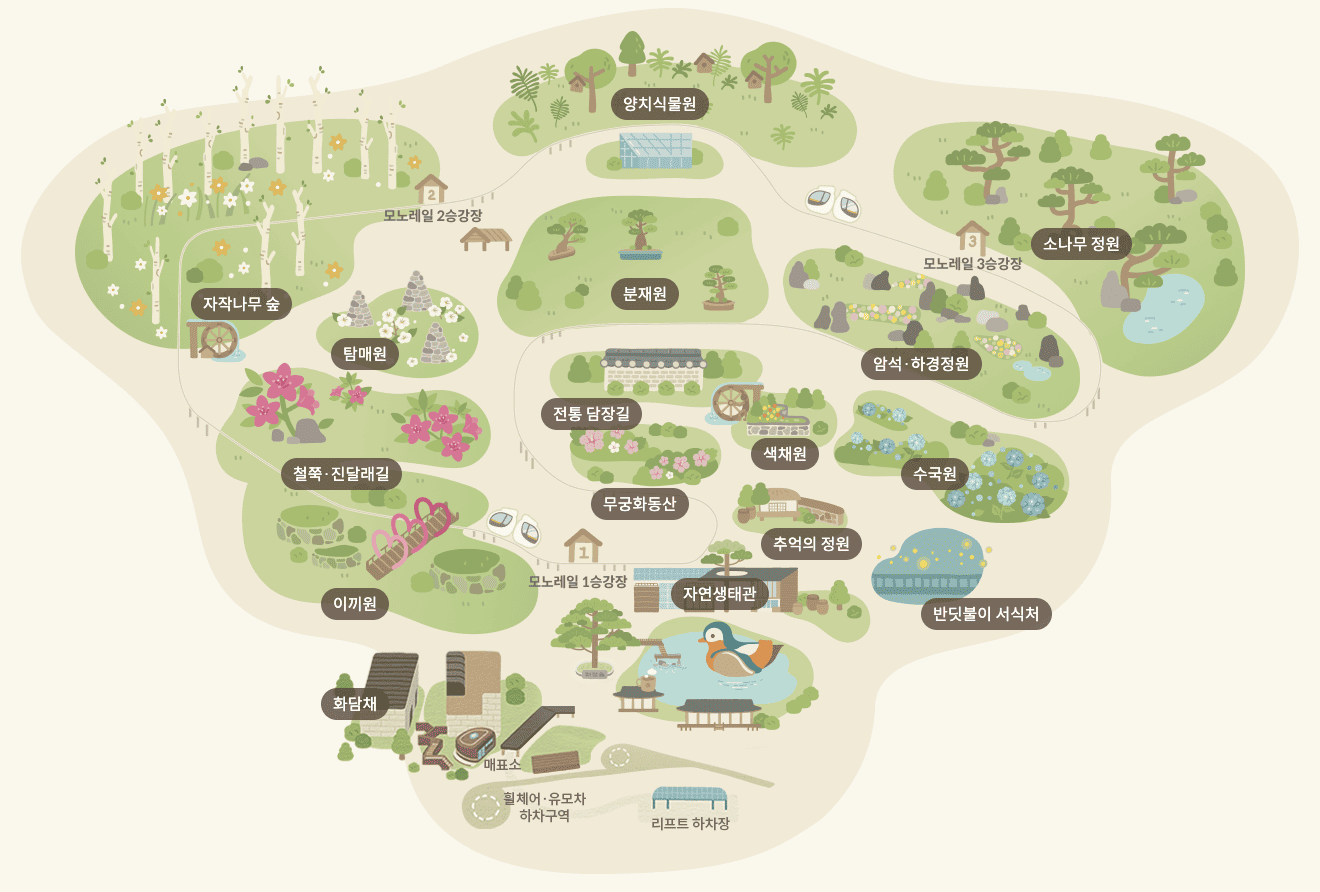 코스: 화담숲 소개 → 모노레일 탑승 → 테마원 산책(양치식물원~원앙연못)