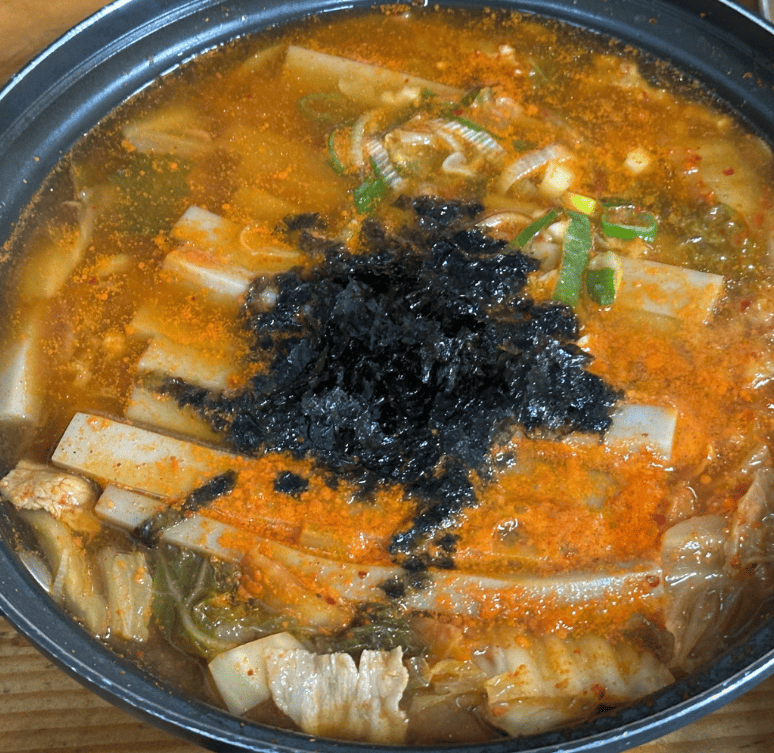 묵, 김치, 고기를 넣어 끓인 칼칼한 국물 요리로, 묵 특유의 부드러운 식감과 어우러져 깊은 맛을 자랑합니다.