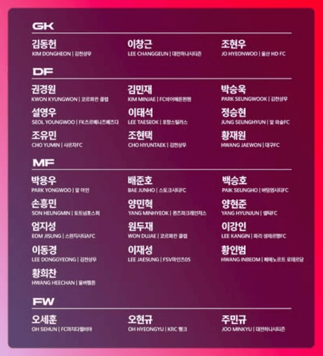 미드필더: 박용우, 배준호, 백승호, 손흥민, 양민혁, 양현준, 엄지성, 원두재, 이강인, 이동경, 이재성, 황인범, 황희찬