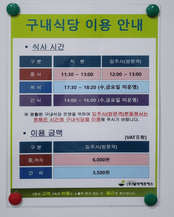 A3. 구내식당에서 점심과 저녁 식사가 가능하며 외부인도 이용할 수 있습니다. 단, 운영 시간이 제한적이니 사전에 확인하세요.