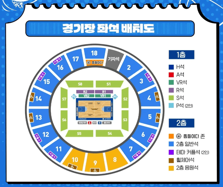 좌석은 2025 현역가왕2 콘서트와 잔나비콘서트, 24-25시즌 썬더스 좌석배치도를 예시로 가져왔으며, 잠실종합운동장 실내체육관에서 진행하는 콘서트/경기는 대부분 아래와 같은 형식으로 좌석을 배치합니다.