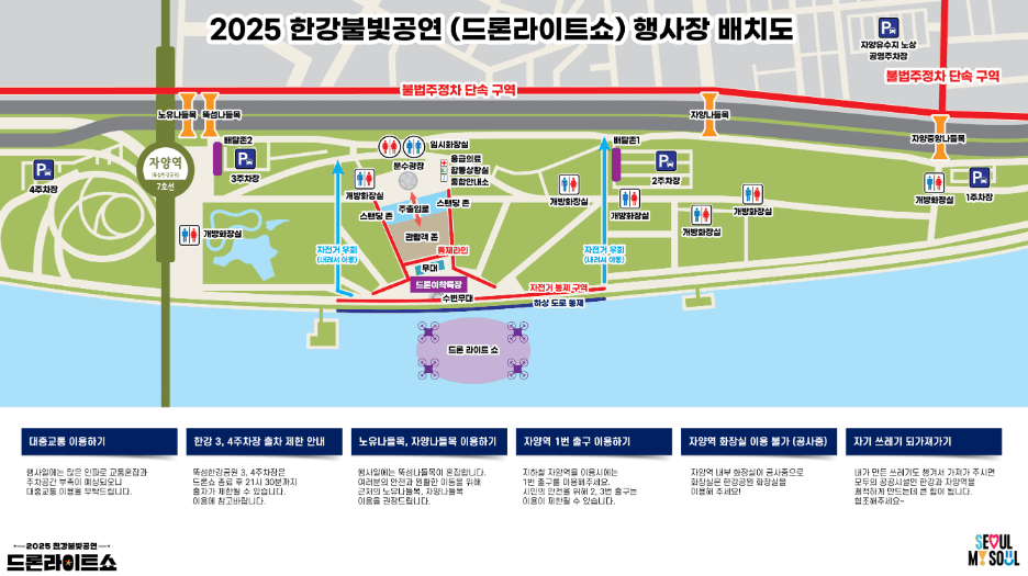 뚝섬한강공원 3,4주차장은 드론쇼 종료 후 21시 30분까지 출차가 제한될 수 있습니다.