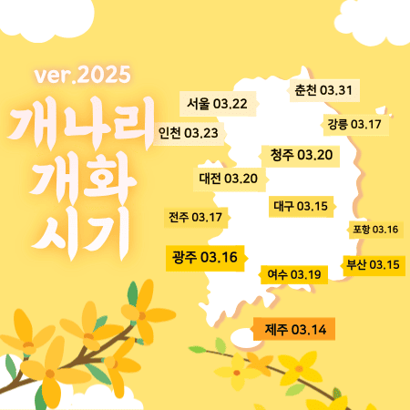 개나리는 봄의 전령으로, 전국 곳곳에서 노란 꽃물결을 이루며 봄의 시작을 알리는데요. 2025년 개나리 개화시기는 다음과 같습니다.
