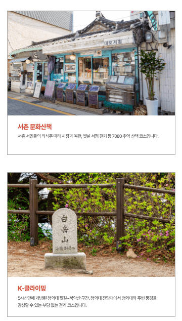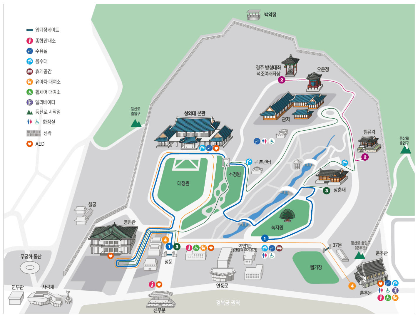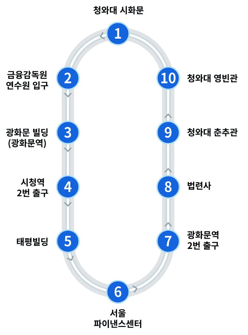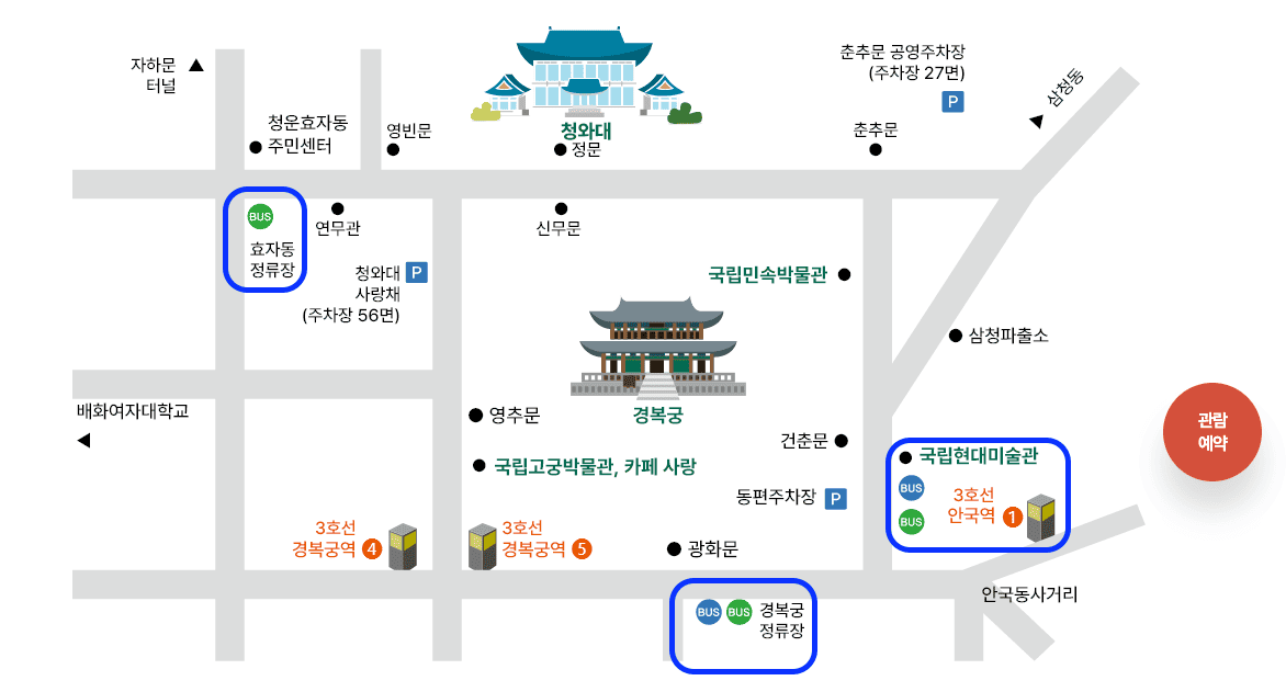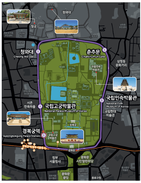 : 경복궁역(효자로입구) ▶ 국립고궁박물관 (영추문) ▶ 청와대 ▶ 춘추문 ▶ 경복궁·국립민속박물관