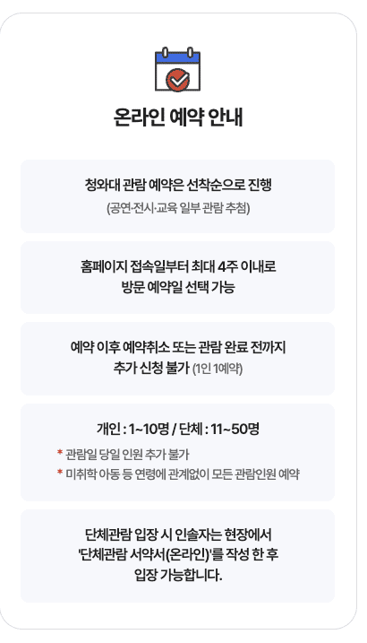 청와대 관람은 100% 사전 예약제로 운영되며, 온라인 예약 또는 현장 신청으로 관람이 가능합니다.