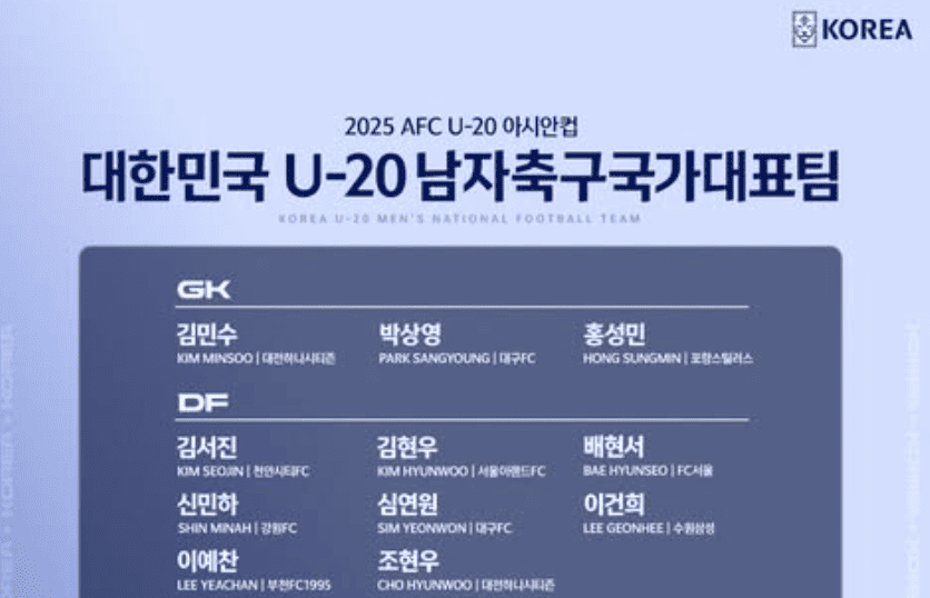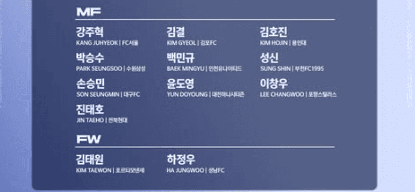| 수비수 | 김서진, 김현우, 배현서, 신민하, 심연원, 이건희, 이예찬, 조현우 |