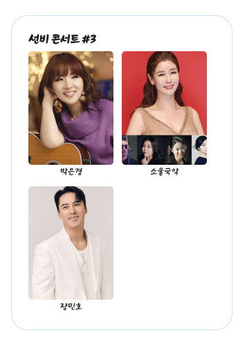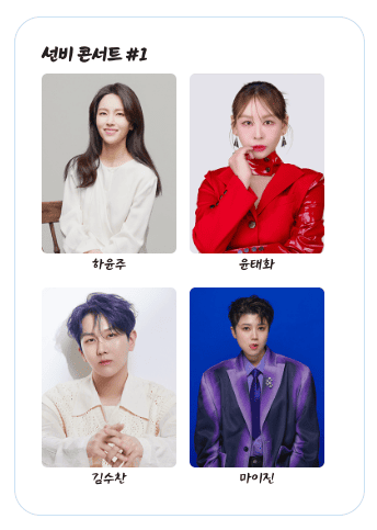 : 하윤주, 윤태화, 김수찬, 마이진 등 인기 가수들이 참여하는 공연이 준비되어 있어요.