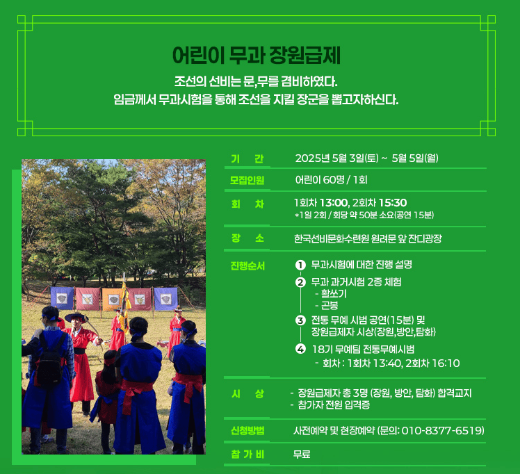 : 문과/무과 시험을 통해 장원급제를 체험할 수 있어요.